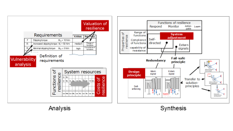 First, requirements shall be identified, assessed and documented. Afterwards components and combinations of components with limited scope of operation will be designed and assessed according to transferable examples. Therefor special product development methods have to be prepared, which can for example define requirements in respect to their vulnerability or formulate generally applicable design principles for resilient subsystems. An assessment method to evaluate the input of additional resources required to ensure resilience will be provided.